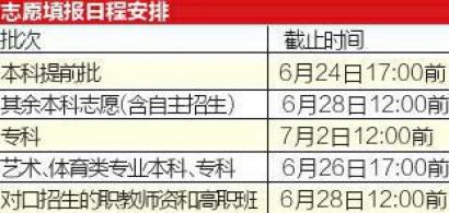 今年的所有高考志愿安排在考生成績出來之后填報,其中本科提前批志愿填報截止時間為6月24日17:00,其余本科志愿(含自主招生志愿)填報截止時間為6月28日12:00,專科志愿在7月2日12:00前填報。藝術(shù)、體育類專業(yè)本科、??浦驹柑顖蠼刂箷r間為6月26日17:00;對口招生的職教師資和高職班志愿均在6月28日12:00前填報。