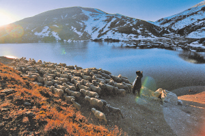 海口牧場(chǎng)海拔高度為3200米,屬于典型的高原山地牧場(chǎng),四面環(huán)山,形成天然盆地。盆地西南角有一高山湖泊,形如弦月,在??诟咴橡┯潮炭铡4合牡酱?,置于湖心,觀(guān)四周秀色,萬(wàn)頃松濤,半天星斗,一枕清霜,晨光曙色之中,輕搖一槳,便有一葉輕舟驚破湖心夢(mèng)之感。